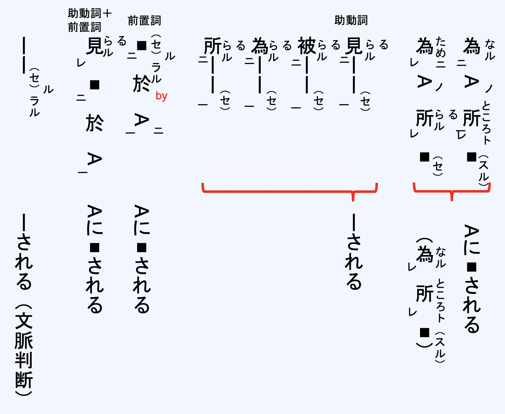 まず、右の2つは、「為A所」によって受け身を表します。注意することは、下のカッコにもあるように、Aが省略される場合があるということです!